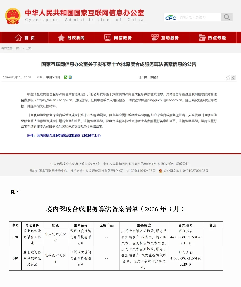 近日,国家互联网信息办公室公布了境内深度合成服务算法备案信息,爱世达自主研发的 “爱世达智能对话生成算法”与 “爱世达设备故障预警生成算法”成功通过备案。这标志着爱世达在“AI+知识管理”与“AI+工业视觉”两大企业级智能应用方向上,其技术安全性、业务合规性均获得了国家权威监管部门的正式认可,是爱世达“AI+场景”落地的重要里程碑。